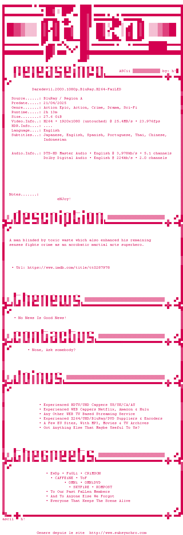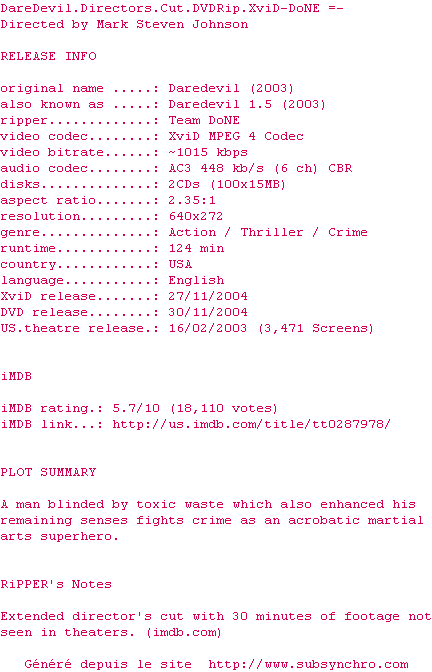 Le commentaire de Yaumegui Commente par Yaumegui (640), Le Lundi 16 Decembre 2013 à 22h02 Film de super-héros descendu par les critique et les spectateurs, mais c'est excessif. Il est vrai que Daredevil dans les comics est un super-héros tourmenté et solitaire, et que là on assiste plutôt à une comédie, mais ça se laisse regarder. 6.5 / 10 1 0