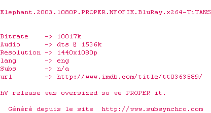 Voir le nfo de la release Elephant.2003.1080P.PROPER.BluRay.x264-TiTANS TiTANS Elephant.2003.1080P.PROPER.BluRay.x264-TiTANS OpenSubtitles 0 fichier