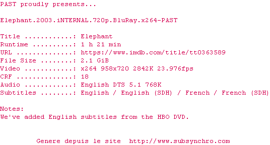 Voir le nfo de la release Elephant.2003.iNTERNAL.720p.BluRay.x264-PAST PAST Elephant.2003.iNTERNAL.720p.BluRay.x264-PAST OpenSubtitles 0 fichier