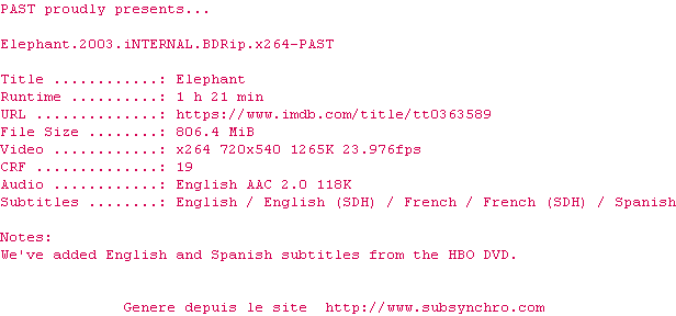 Voir le nfo de la release Elephant.2003.iNTERNAL.BDRip.x264-PAST PAST Elephant.2003.iNTERNAL.BDRip.x264-PAST OpenSubtitles 0 fichier