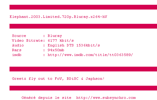 Voir le nfo de la release Elephant.2003.Limited.720p.Bluray.x264-hV hV Elephant.2003.Limited.720p.Bluray.x264-hV OpenSubtitles 0 fichier