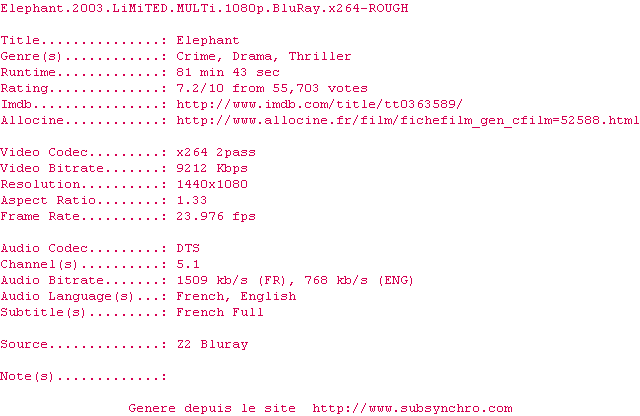 Voir le nfo de la release Elephant.2003.LiMiTED.MULTi.1080p.BluRay.x264-ROUGH ROUGH Elephant.2003.LiMiTED.MULTi.1080p.BluRay.x264-ROUGH OpenSubtitles 0 fichier