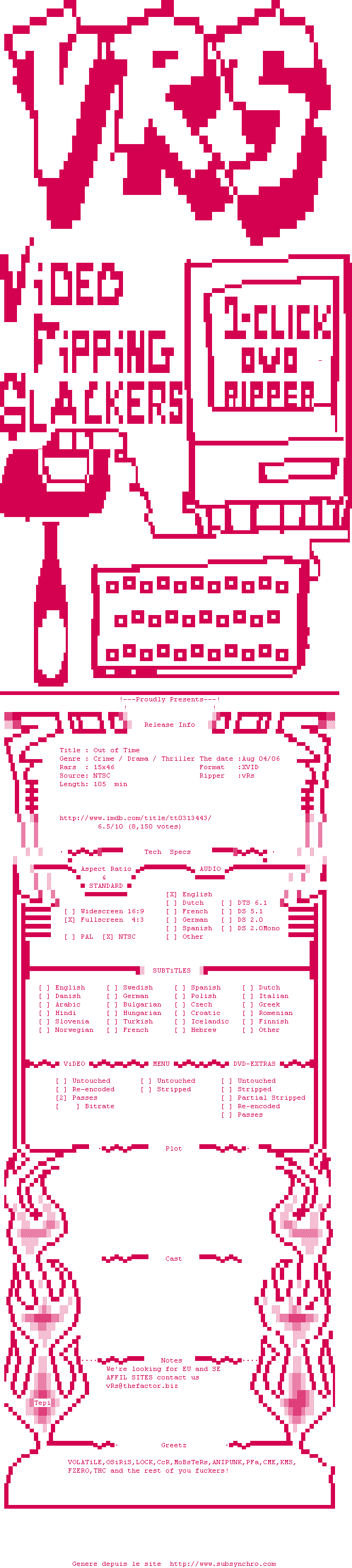 Y avez-vous pense ? Nous proposons déjà 1544 sous-titres pour le film Out of Time. Avez-vous essaye de voir si ces sous-titres etaient compatibles avec cette release ? On vous laisse le soin de tester cela pour nous et de contribuer au site en postant le sous-titre en cas de compatiblite constatee !
