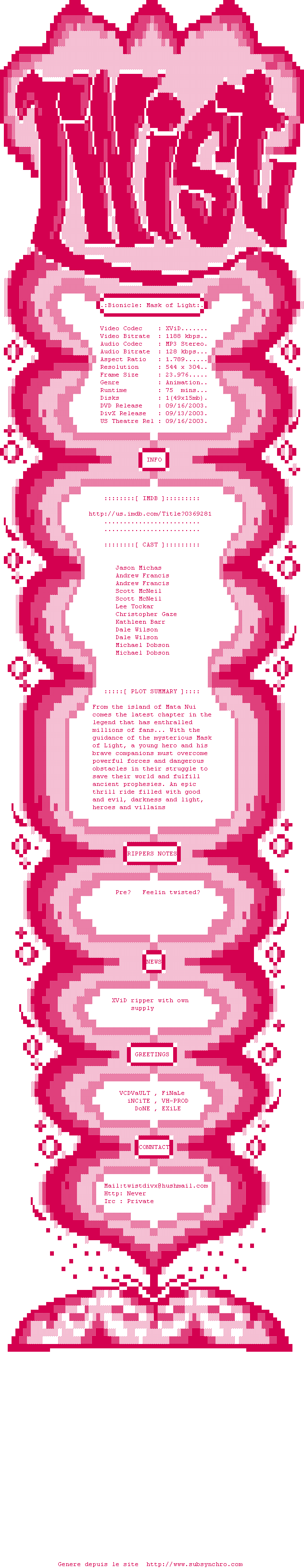 Voir le nfo de la release Bionicle.Mask.Of.Light.2003.DVDRip.XviD-TWiST