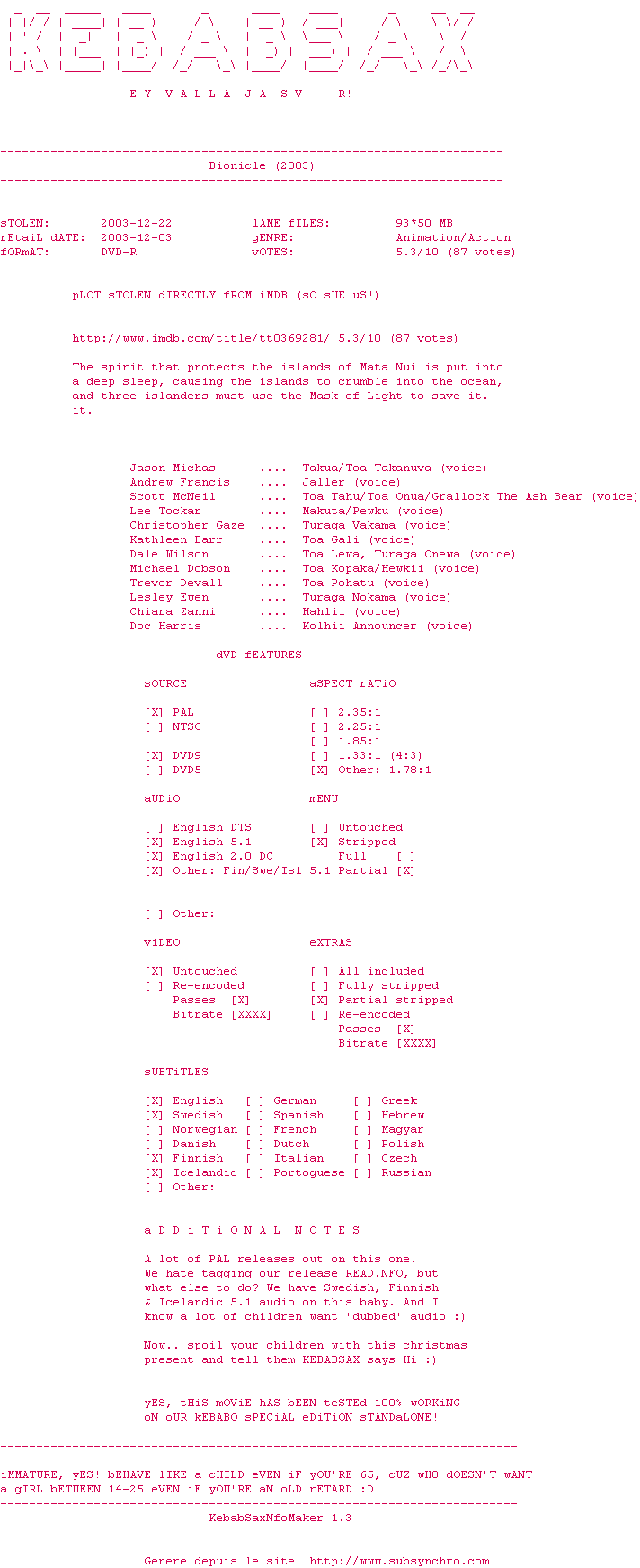 Voir le nfo de la release Bionicle.Mask.Of.Light.2003.STV.READ.NFO.PAL.DVDR-KEBABSAX