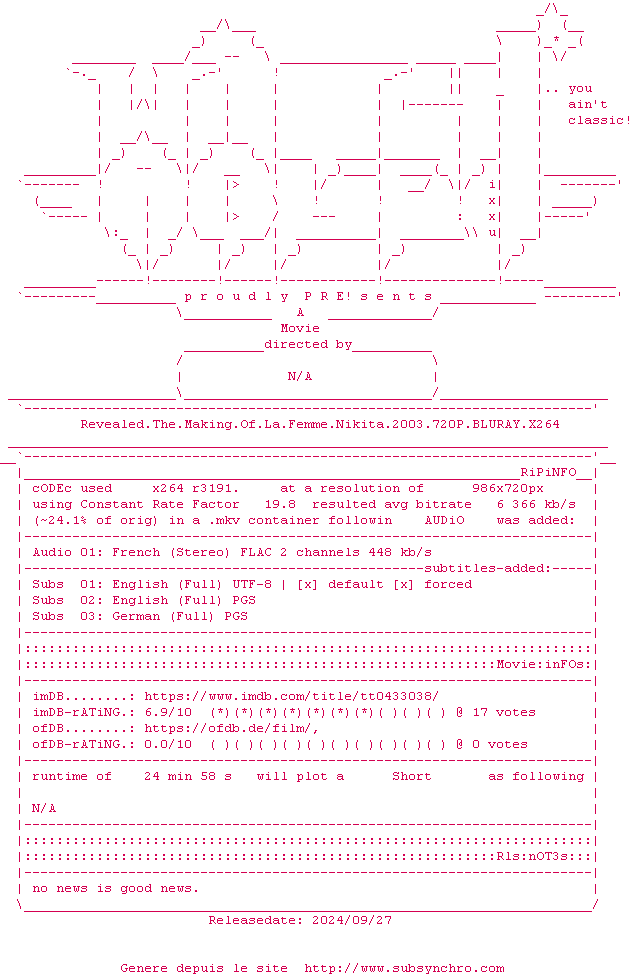 Voir le nfo de la release Revealed.The.Making.Of.La.Femme.Nikita.2003.720P.BLURAY.x264-WATCHABLE