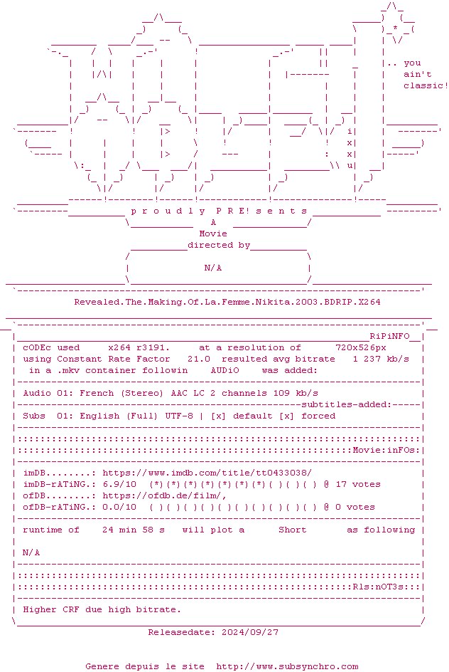 Voir le nfo de la release Revealed.The.Making.Of.La.Femme.Nikita.2003.BDRIP.x264-WATCHABLE