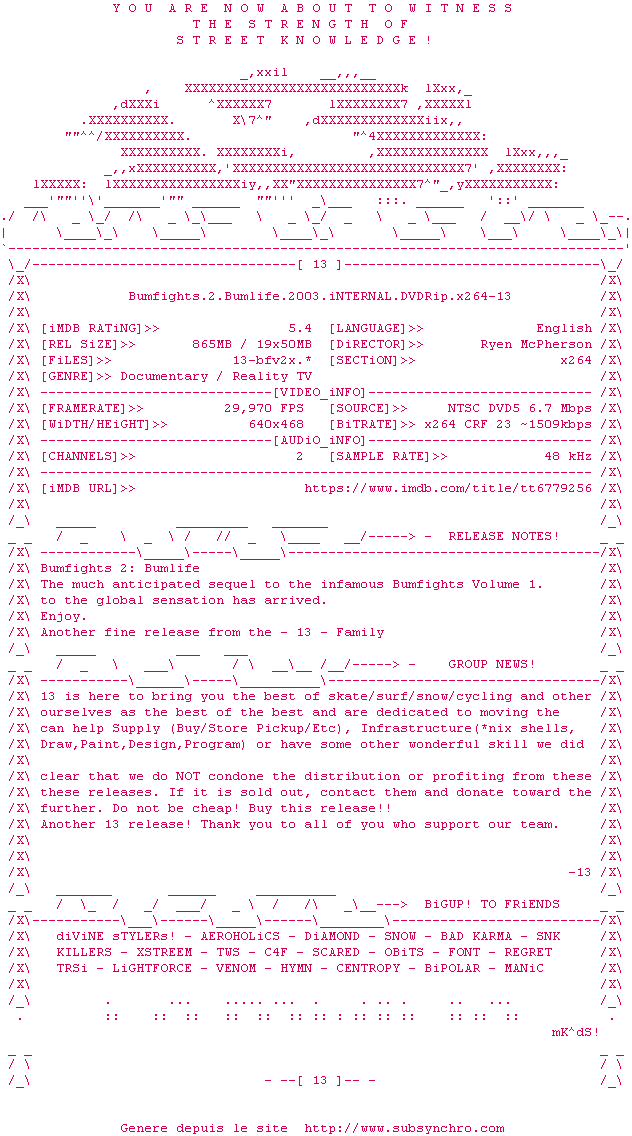 | Voir le nfo de la release Bumfights.2.Bumlife.2003.iNTERNAL.DVDRip.x264-13 | 13 | Bumfights.2.Bumlife.2003.iNTERNAL.DVDRip.x264-13 OpenSubtitles | 0 fichier | ||
