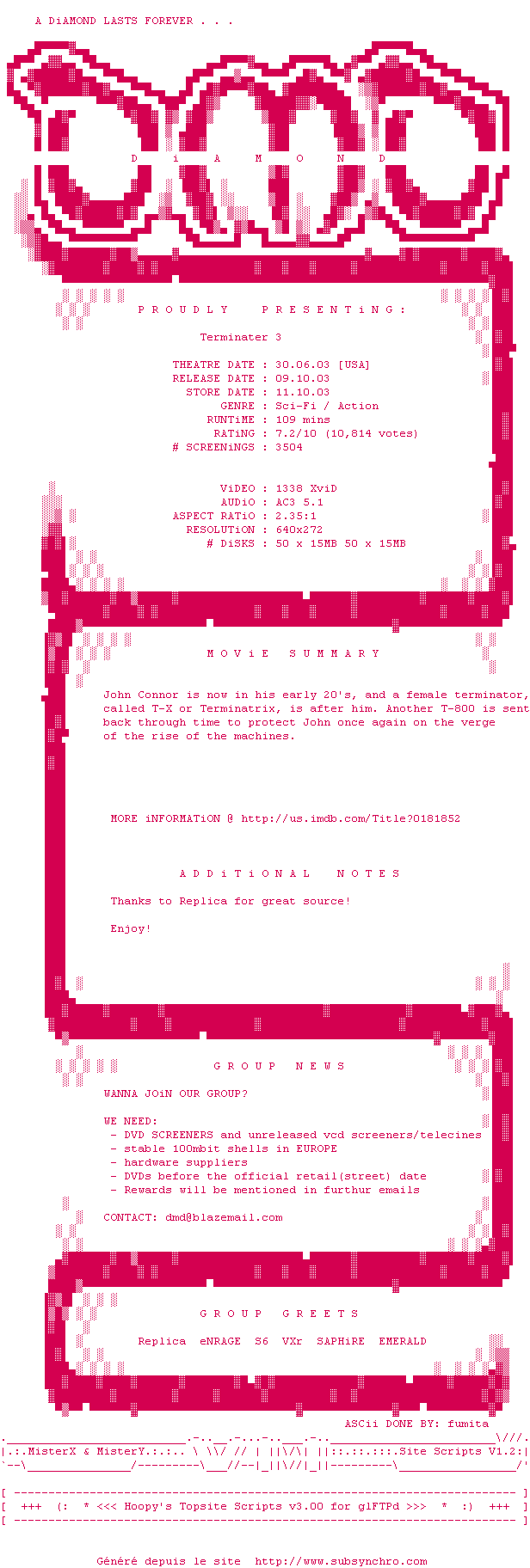 Voir le nfo de la release Terminator.3.Rise.Of.The.Machines.DVDRip.XviD-DiAMOND