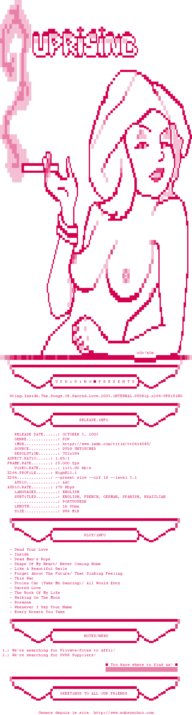| Voir le nfo de la release Sting.Inside.The.Songs.Of.Sacred.Love.2003.iNTERNAL.DVDRip.x264-UPRiSiNG | UPRiSiNG | Sting.Inside.The.Songs.Of.Sacred.Love.2003.iNTERNAL.DVDRip.x264-UPRiSiNG OpenSubtitles | 0 fichier |