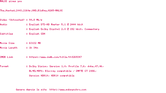Voir le nfo de la release The.Hunted.2003.2160p.UHD.BluRay.H265-MALUS