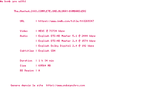 Voir le nfo de la release The.Hunted.2003.REMASTERED.1080p.BluRay.HEVC.x265.5.1-BONE