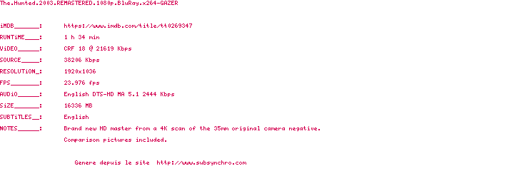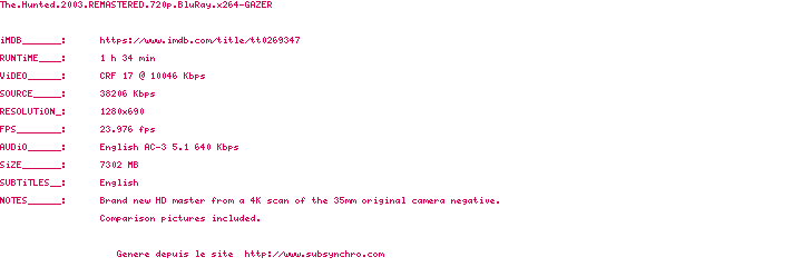 Voir le nfo de la release The.Hunted.2003.REMASTERED.BDRip.x264-GAZER