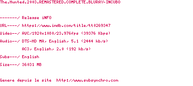 Voir le nfo de la release The.Hunted.2003.REMASTERED.COMPLETE.BLURAY-INCUBO