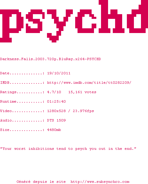 Voir le nfo de la release Darkness.Falls.2003.720p.BluRay.x264-PSYCHD