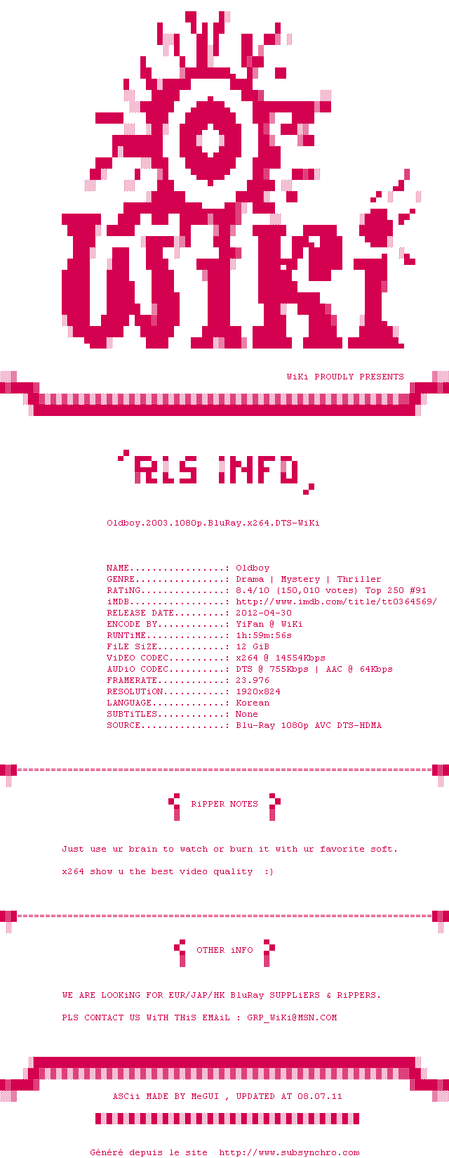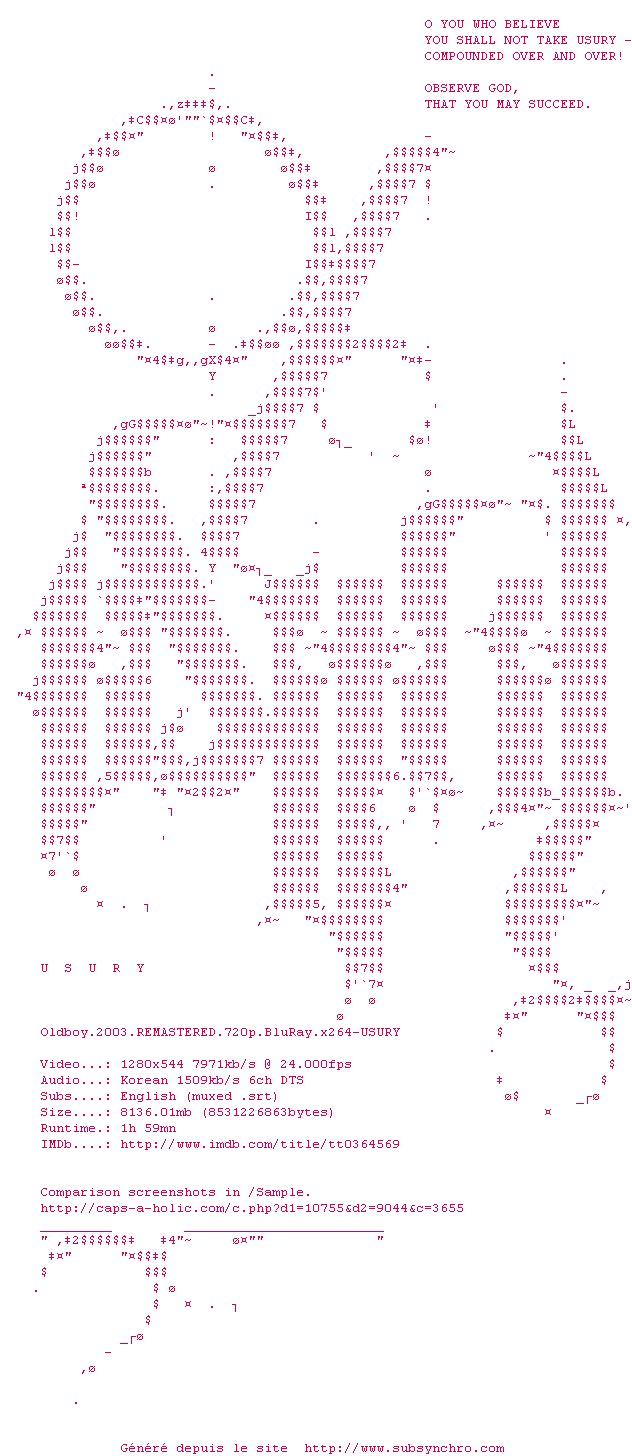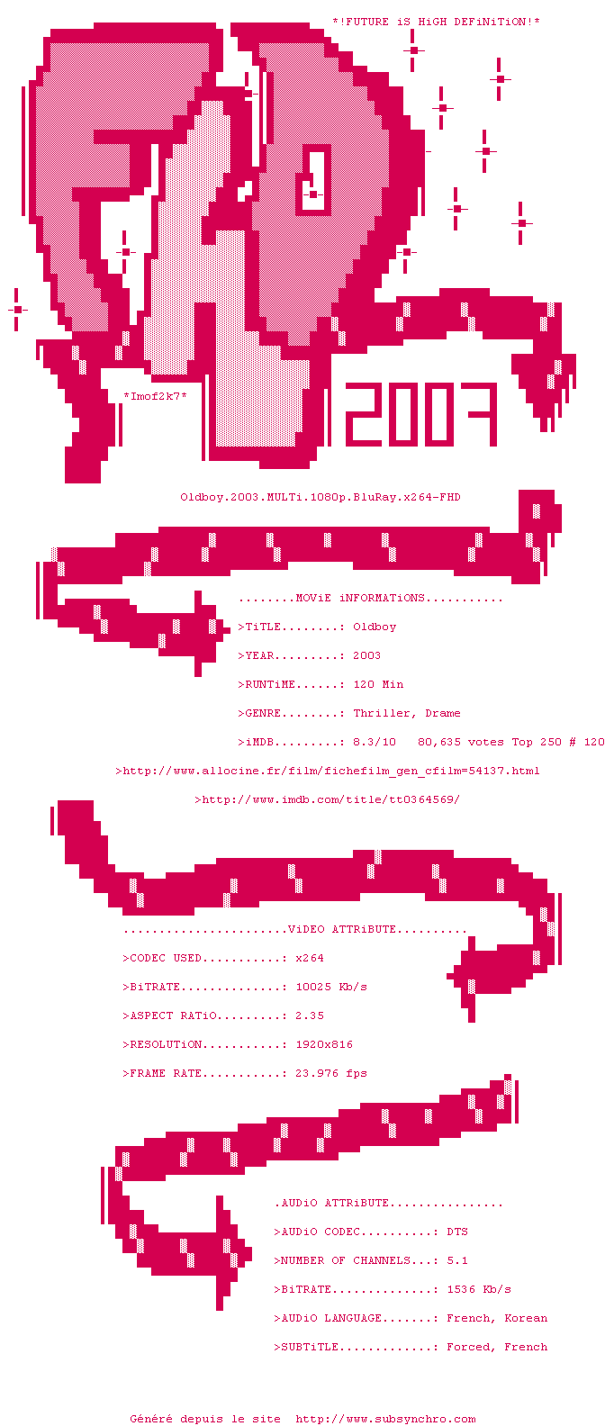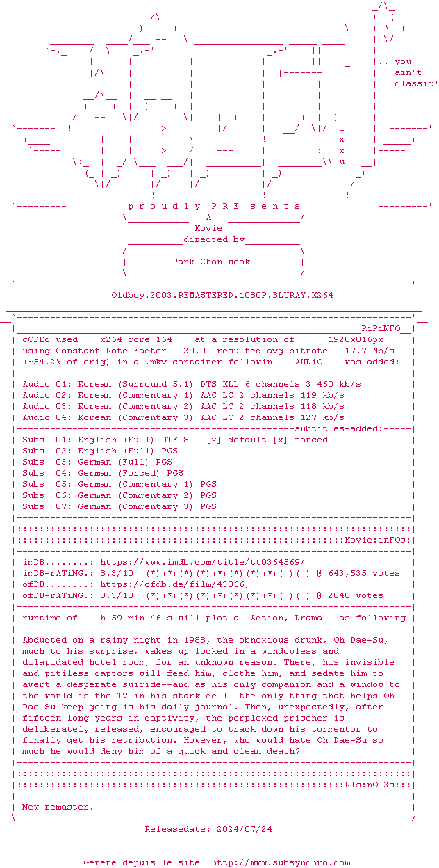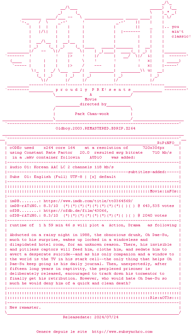 Old Boy fait parti de ces rares films qui laisse sur les fesses quasiment unanimement. Old Boy frise donc la perfection si celle-ci n'existe pas, forcé de constater que le film s'en approche au plus près. Tout est superbe, les images, les comédiens, la réalisation, la musique (un chef d'oeuvre à elle toute seule) et ce scénario, imprévisible, jusqu'au dénouement final. Un film dur, âpres, dramatique et violent où l'amour est pourtant très souvent présent. Un film à ne pas manquer, à revoir et à revoir. Une leçon de cinéma.