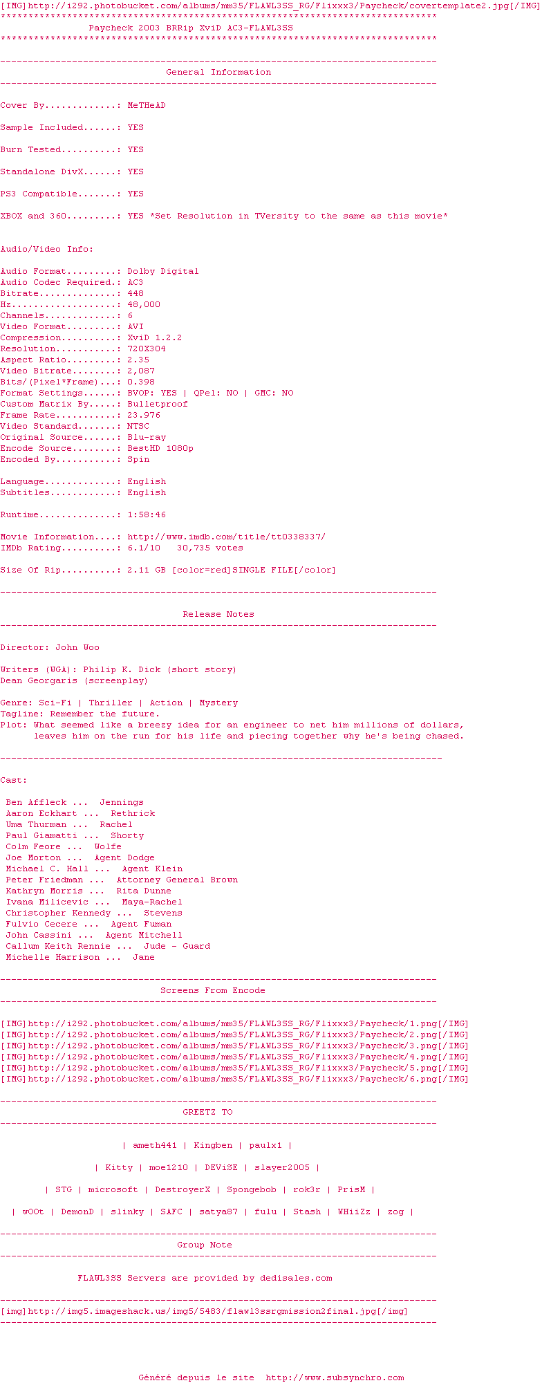 Voir le nfo de la release Paycheck.2003.BRRip.XviD.AC3-FLAWL3SS