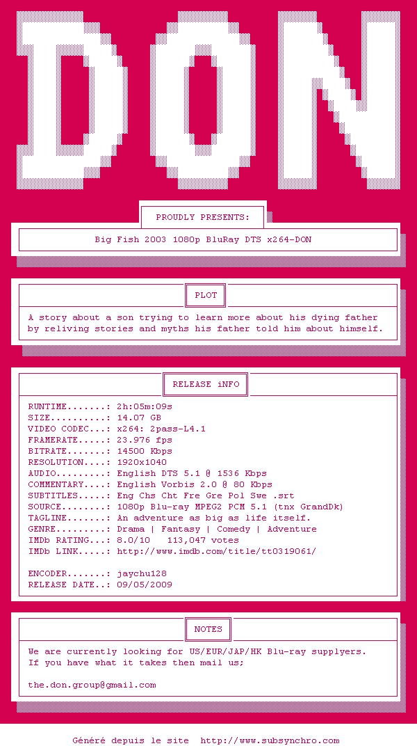 Voir le nfo de la release Big.Fish.2003.1080p.BluRay.DTS.x264-DON