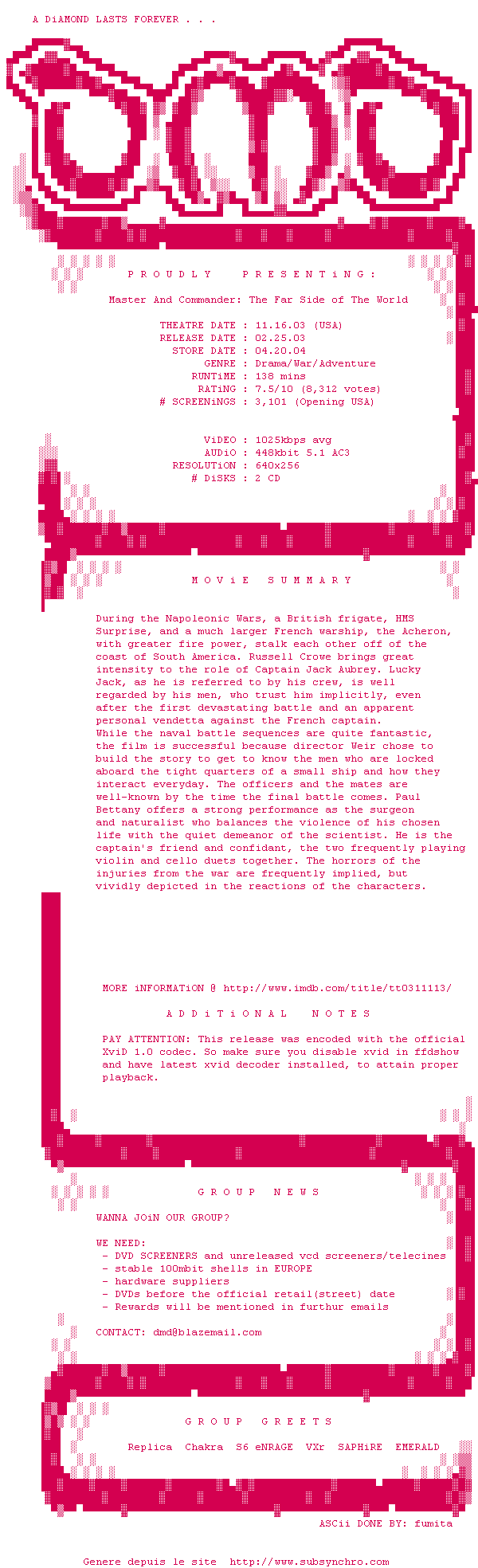 Voir le nfo de la release Master.And.Commander.DVDRip.XviD-DiAMOND