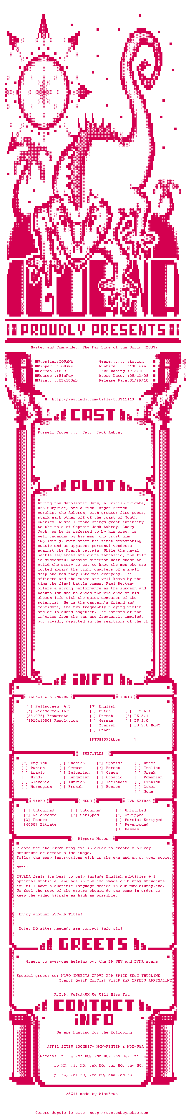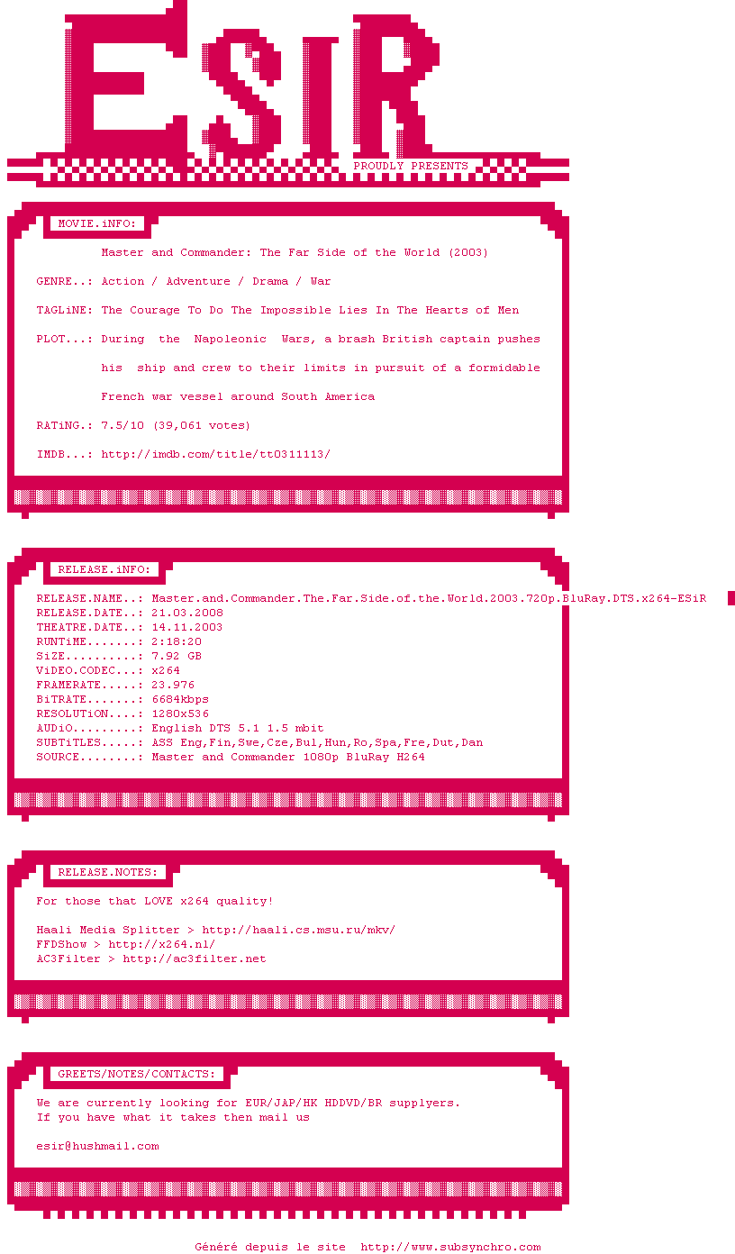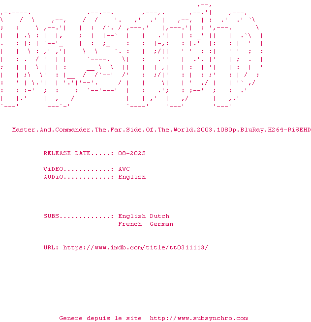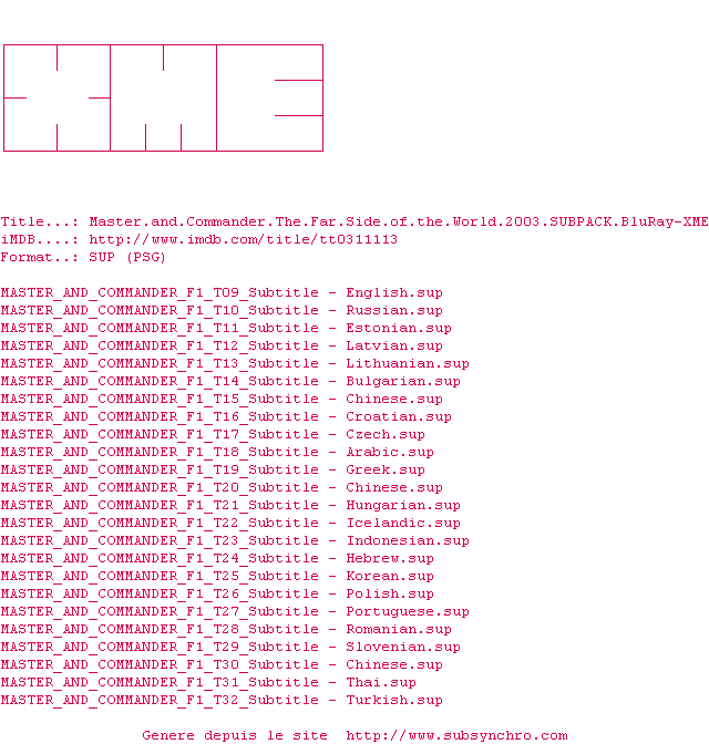 Voir le nfo de la release Master.And.Commander.The.Far.Side.Of.The.World.2003.SUBPACK.BluRay-XME