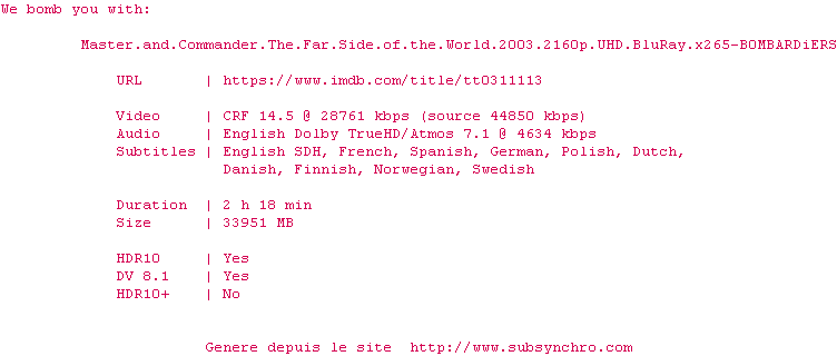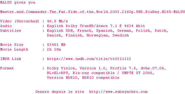 Voir le nfo de la release Master.And.Commander.The.Far.Side.Of.The.World.2003.2160p.UHD.BluRay.H265-MALUS