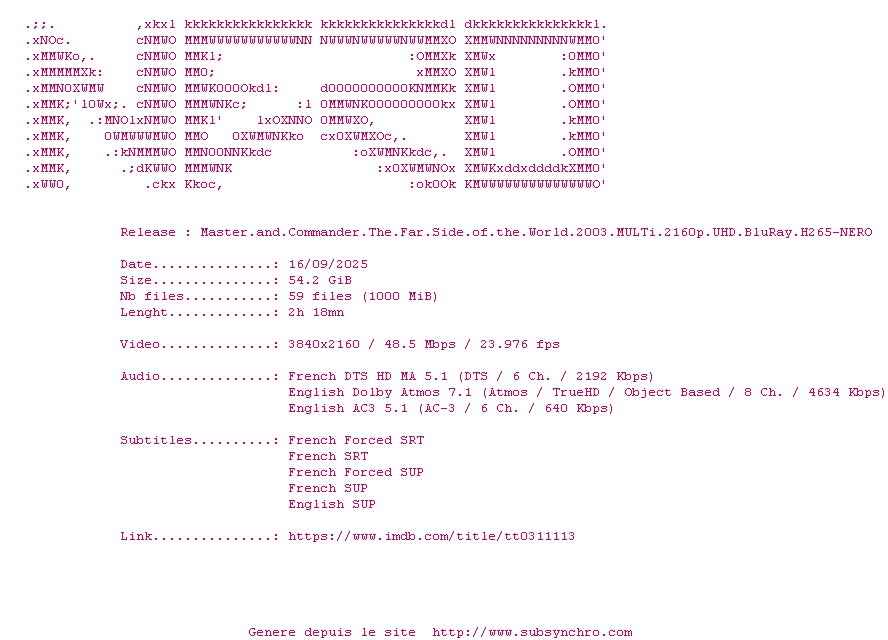 Voir le nfo de la release Master.And.Commander.The.Far.Side.Of.The.World.2003.MULTi.2160p.UHD.BluRay.H265-NERO