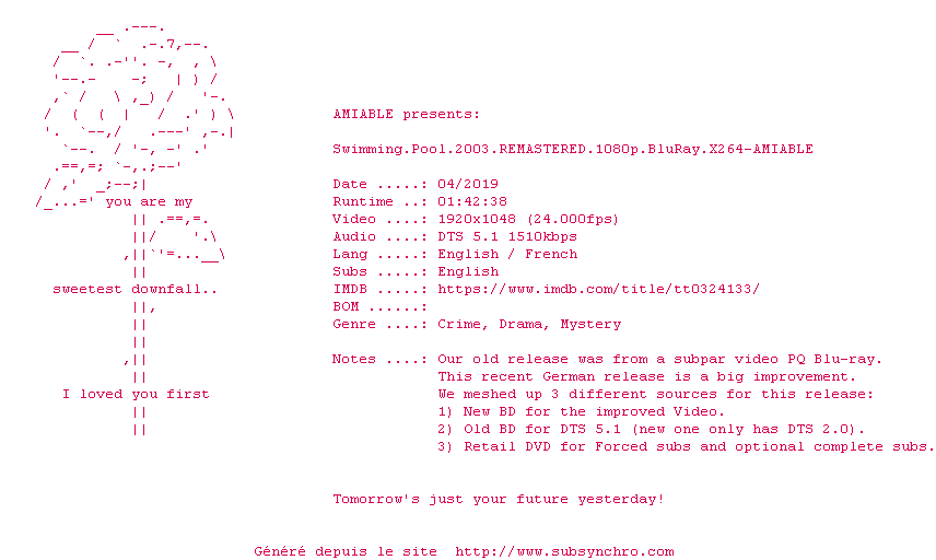 Voir le nfo de la release Swimming.Pool.2003.REMASTERED.1080p.BluRay.x264-AMIABLE