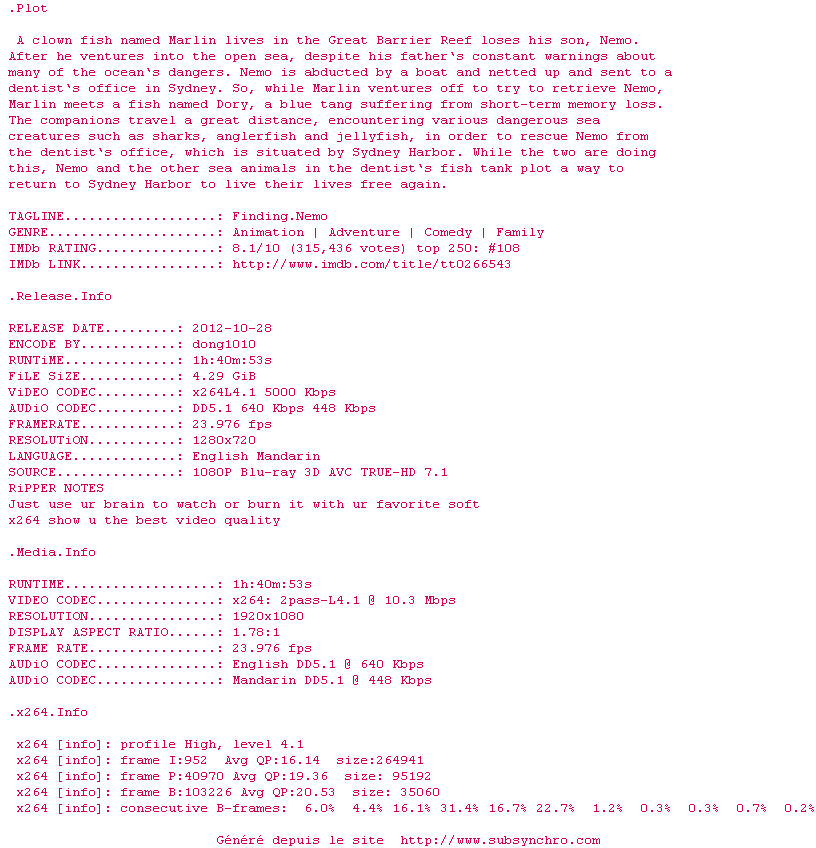 Telechargez le RSS « Fichier de la release Finding.Nemo.2003.720p.BluRay.x264-WiKi »