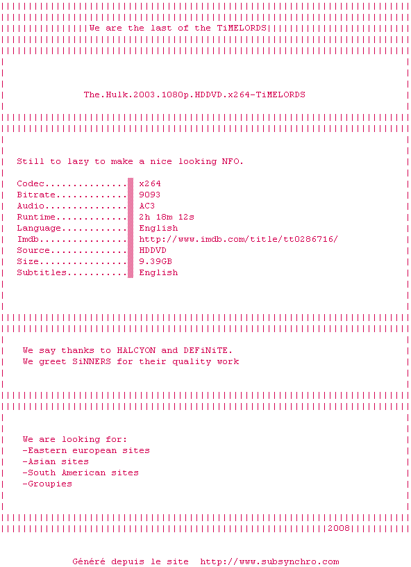 Telechargez le RSS « Fichier de la release The.Hulk.2003.1080p.HDDVD.x264-TiMELORDS »
