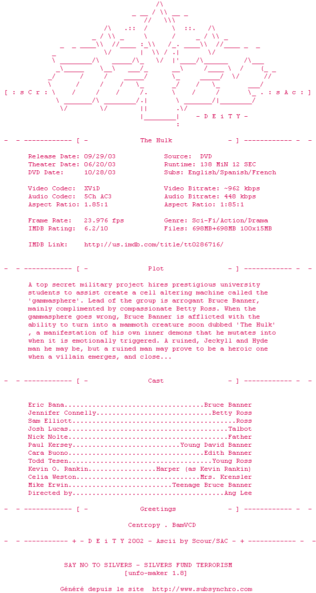 Telechargez le RSS « Fichier de la release The.Hulk.DVDRiP.XViD-DEiTY »