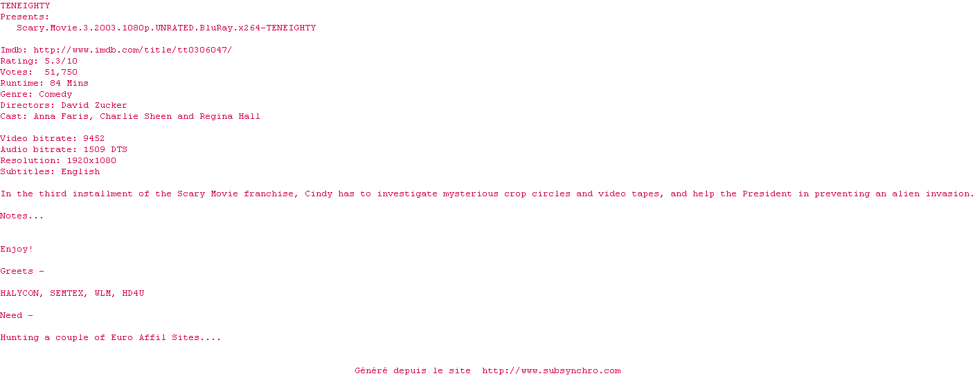 Telecharger le ZiP contenant NFO, Affiche, Sous-titre (*.srt)