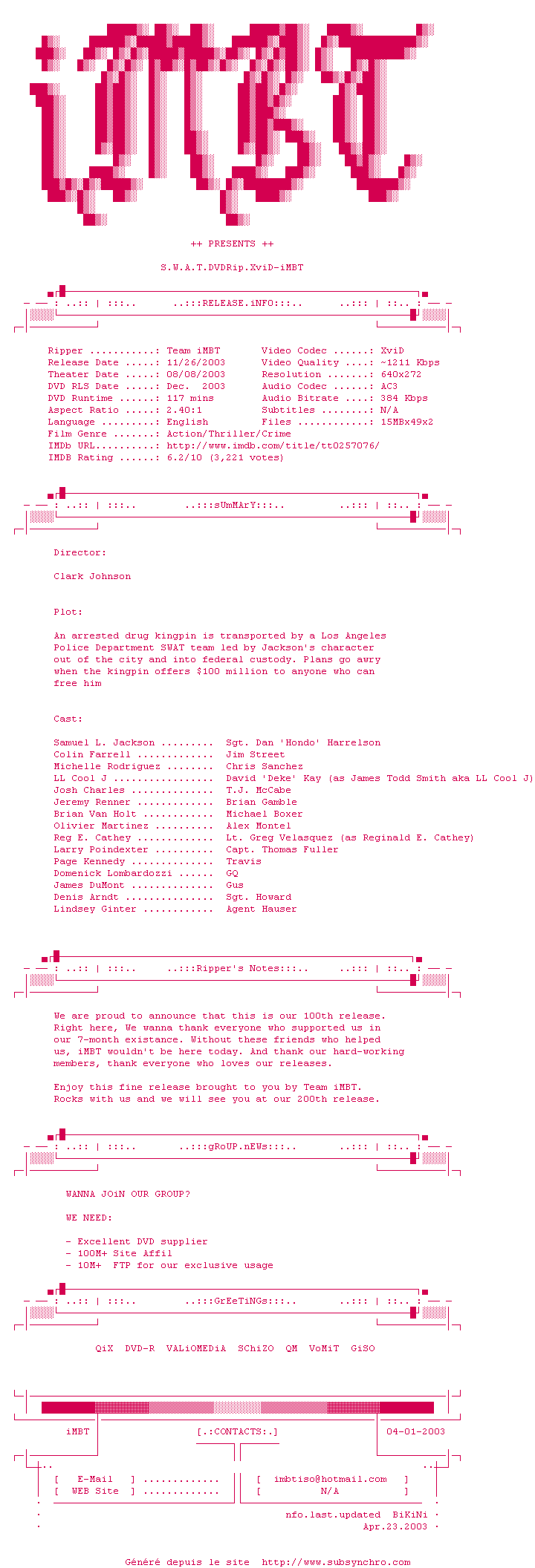 Telechargez le RSS « Fichier de la release S.W.A.T.DVDRip.XviD-iMBT »