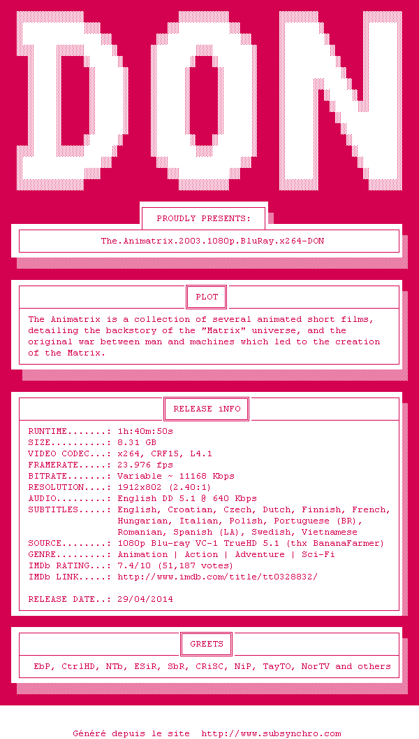 Telechargez le RSS « Fichier de la release The.Animatrix.2003.1080p.BluRay.x264-DON »