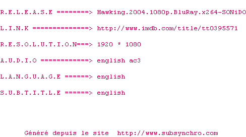 | Voir le nfo de la release Hawking.2004.1080p.BluRay.x264-SONiDO | SONiDO | Hawking.2004.1080p.BluRay.x264-SONiDO OpenSubtitles | 0 fichier | ||