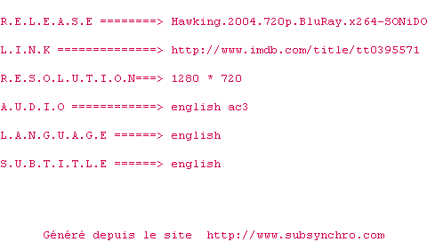| Voir le nfo de la release Hawking.2004.720p.BluRay.x264-SONiDO | SONiDO | Hawking.2004.720p.BluRay.x264-SONiDO OpenSubtitles | 0 fichier | ||
