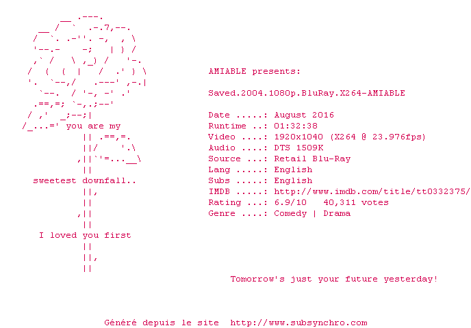 | Voir le nfo de la release Saved.2004.720p.BluRay.x264-AMIABLE | AMIABLE | Saved.2004.720p.BluRay.x264-AMIABLE OpenSubtitles | 07/02/2018 | Disponible en Z1 | 1 fichier |