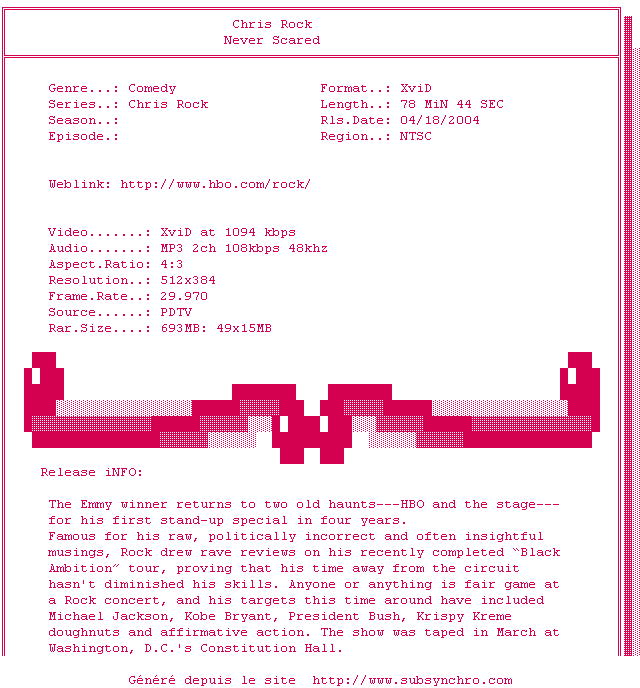 | Voir le nfo de la release Chris.Rock.Never.Scared.PDTV.XviD-PyRo | PyRo | Chris.Rock.Never.Scared.PDTV.XviD-PyRo OpenSubtitles | 0 fichier | ||