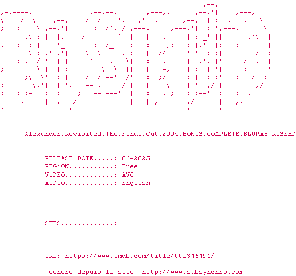 Voir le nfo de la release Alexander.Revisited.The.Final.Cut.2004.BONUS.COMPLETE.BLURAY-RiSEHD