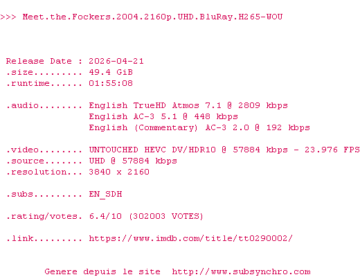 La release Meet.The.Fockers.2004.2160p.UHD.BluRay.H265-WOU est en 4K