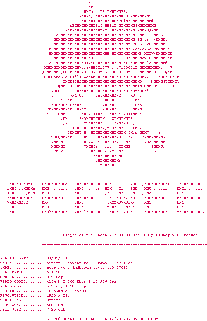 Voir le nfo de la release Flight.Of.The.Phoenix.2004.DKSubs.1080p.BluRay.x264-PeeWee