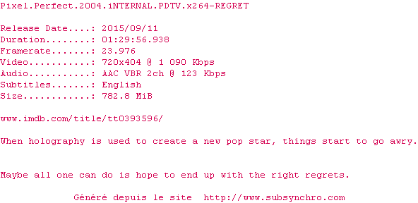 Voir le nfo de la release Pixel.Perfect.2004.iNTERNAL.PDTV.x264-REGRET