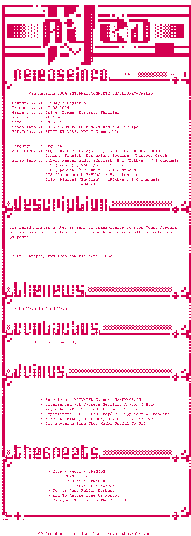 Voir le nfo de la release Van.Helsing.2004.2160p.UHD.BluRay.H265-FaiLED