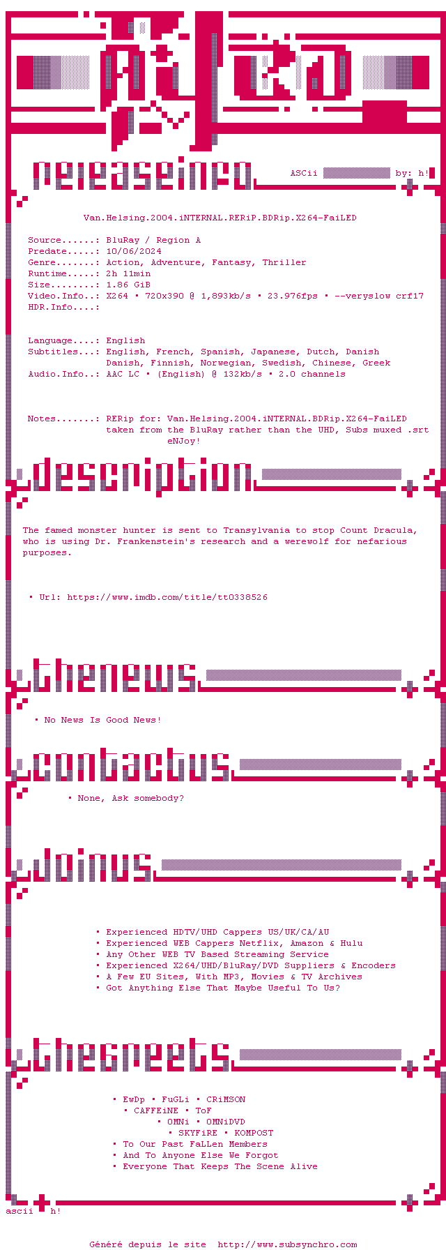 Voir le nfo de la release Van.Helsing.2004.DUAL.COMPLETE.BLURAY-FaiLED