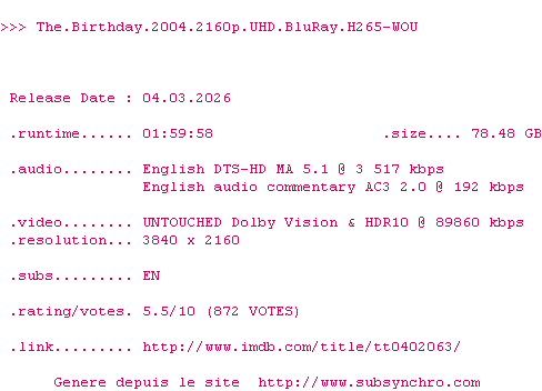 La release The.Birthday.2004.2160p.UHD.BluRay.H265-WOU est en 4K