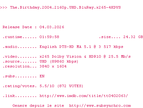 La release The.Birthday.2004.2160p.UHD.BluRay.x265-4KDVS est en 4K