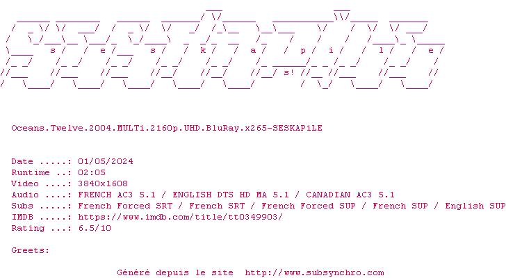 Voir le nfo de la release Oceans.Twelve.2004.MULTi.2160p.UHD.BluRay.x265-SESKAPiLE
