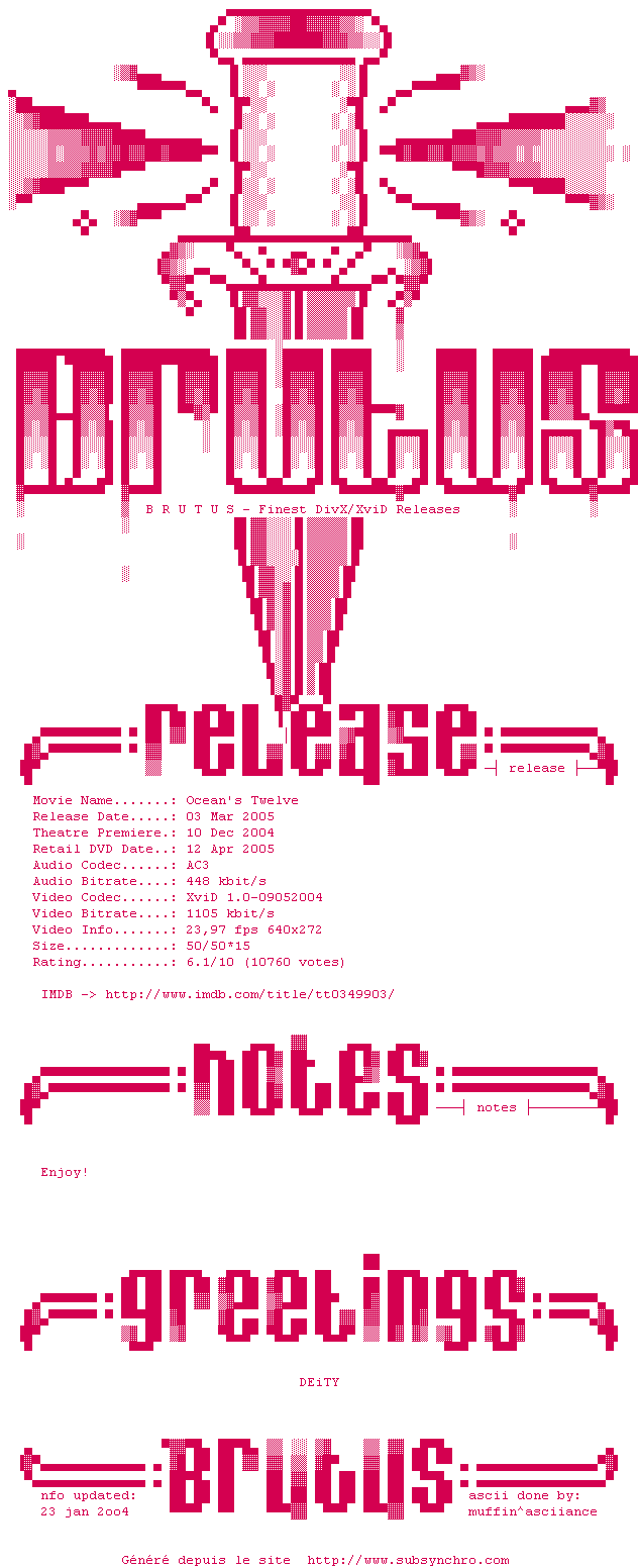 Voir le nfo de la release Oceans.Twelve.DVDRiP.XviD-BRUTUS