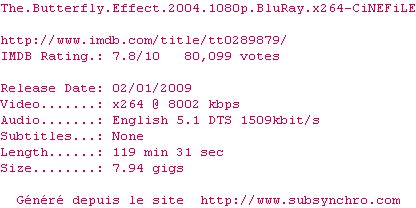 Voir le nfo de la release The.Butterfly.Effect.2004.1080p.BluRay.x264-CiNEFiLE