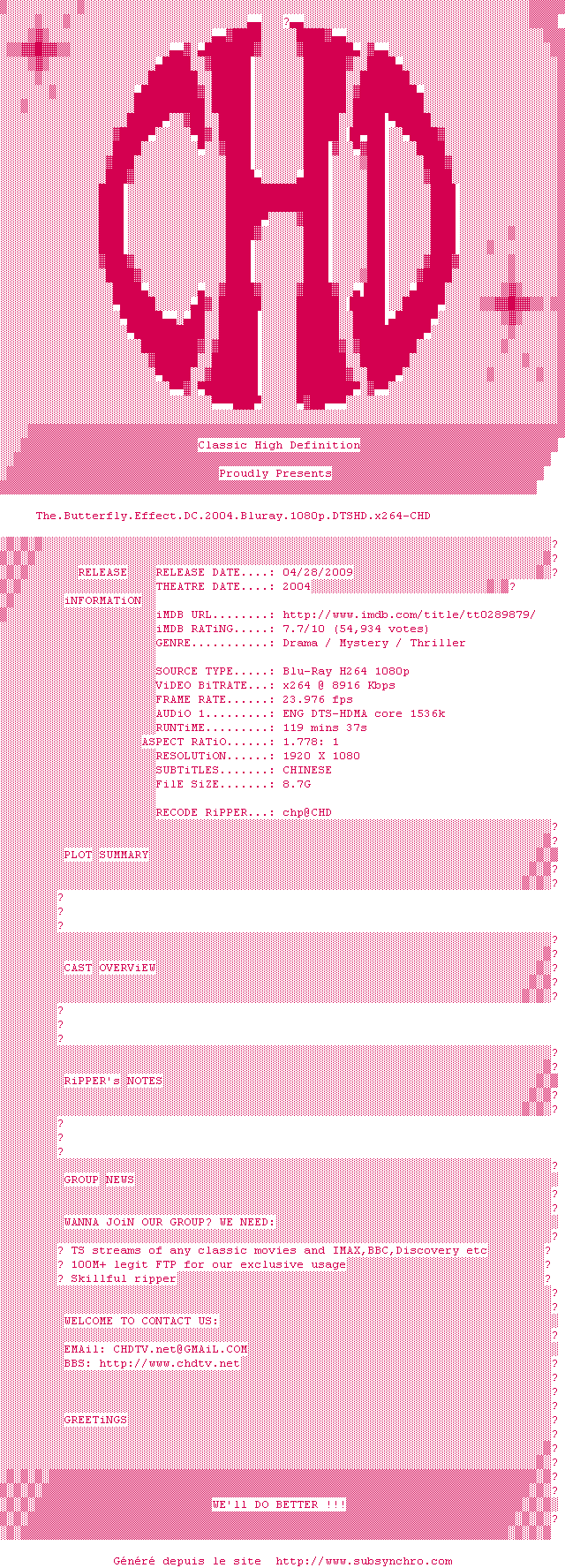 Voir le nfo de la release The.Butterfly.Effect.DC.2004.Bluray.1080p.DTSHD.x264-CHD