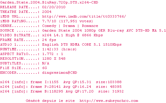 Voir le nfo de la release Garden.State.2004.BluRay.720p.DTS.x264-CHD